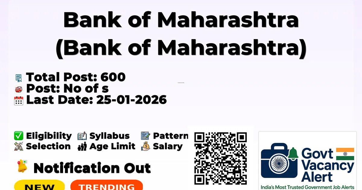 Bank of Maharashtra has released an official notification for the recruitment of 600 Apprentice Posts. Interested and eligible candidates can apply Online through the official Bank of Maharashtra website. The last date to submit the application form is 25-01-2026. In this article, you’ll find the Bank of Maharashtra Apprentice Posts recruitment details, including eligibility criteria, age limit, salary structure, selection process, application steps, and direct links to the official notification and Online application form. Trending Govt Jobs Indian Navy 260 SSC Officer Online Form 2026 Income Tax Steno, MTS Online Form 2026 RRB 22000 Group D Online form 2026 Indian Army 350 SSC Tech Men Online Form 2026 MP Apex Bank 2076 Clerk, Officer Online Form 2026 Advertisement Company Name Bank of Maharashtra (Bank of Maharashtra) Post Name Apprentice No of Posts 600 Salary Available Soon Qualification Available Soon Age Limit Available Soon Start Date for Apply Online 15-01-2026 Last Date for Apply Online 25-01-2026 Official Website bankofmaharashtra.bank.in Free Online Mock Tests View all Railway NTPC Mock Test Attempt Now IBPS Clerk Mock Test Attempt Now SSC CHSL Mock Test Attempt Now View All Mock Tests Post Name No of Posts Apprentice 600 Available Soon Available Soon Age relaxation is applicable as per rules. Available Soon Starting Date for Apply Online: 15-01-2026 Last Date for Apply Online: 25-01-2026 Available Soon Available Soon Apply Online: Click here Short Notification PDF: Click here Official Website: Click here Join Arattai Channel: Click Here Join Telegram Channel: Click Here Join WhatsApp Channel: Click Here Sarkari Result: Click Here Download Mobile App: Click Here