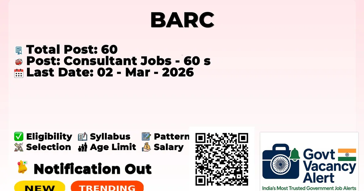 Bhabha Atomic Research Centre (BARC) has declared the official notification for 2026. To fill up the 60 vacancies for Consultant Jobs. Those candidates who have qualified in the 10th Pass, Any Degree can use this opportunity and apply for the BARC Notification 2026. Here, we included the age limit, selection process, salary structure, education details, application fee, and how to apply for these posts. Interested and eligible candidates can apply before the application deadline.
