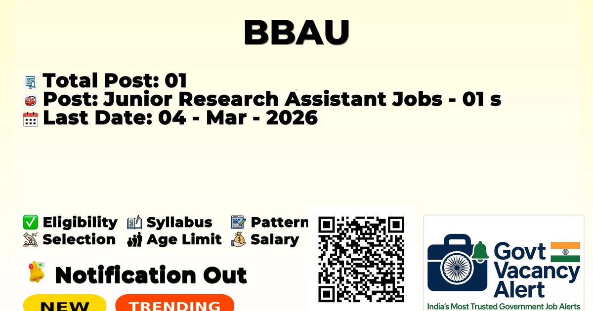 The Babasaheb Bhimrao Ambedkar University (BBAU) has officially released the notification to fill the vacancies of 01 Junior Research Assistant Posts. Interested and eligibile candidates can use this opportunity to apply for these posts before the last date of application. Candidates who have completed their B. Pharm, M. Pharm can apply for the BBAU Notification 2026. The interested applicants can attend the walk-in interview. Here we have mentioned the education details, age limit, selection process, application fee, salary, and how to apply for these posts before the deadline. The application dates have already begun.