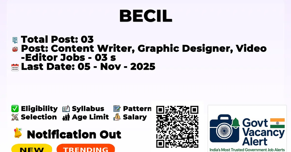 Broadcast Engineering Consultants India (BECIL) has declared the official notification for 2025. To fill up the vacancies for Content Writer, Graphic Designer, and Video Editor Jobs. Those candidates who have qualified in the B.E/ B.Tech, Diploma, and Post Graduation can grab this chance and apply for the BECIL Recruitment 2025. Here, we mentioned the age limit, selection process, salary structure, education details, application fee, and how to apply for these posts. Interested candidates can apply before the last date of application.