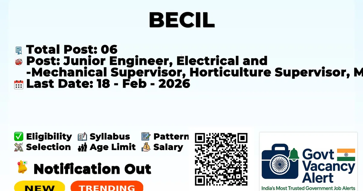 The Broadcast Engineering Consultants India Limited (BECIL) has officially released the notification to fill the vacancies of 06 Junior Engineers, Electrical and Mechanical Supervisors, Horticulture Supervisors, and Multi Skilled Staff Jobs. Interested and eligibile candidates can use this opportunity to apply for these posts before the last date of application. Candidates who have completed their Diploma, B.E./B. Tech in Electrical, Mechanical, Civil Engineering, ITI, 12th can apply for the BECIL Notification 2026. The interested applicants can apply in offline mode. Here we have mentioned the education details, age limit, selection process, application fee, salary, and how to apply for these posts before the deadline. The application dates have already begun.