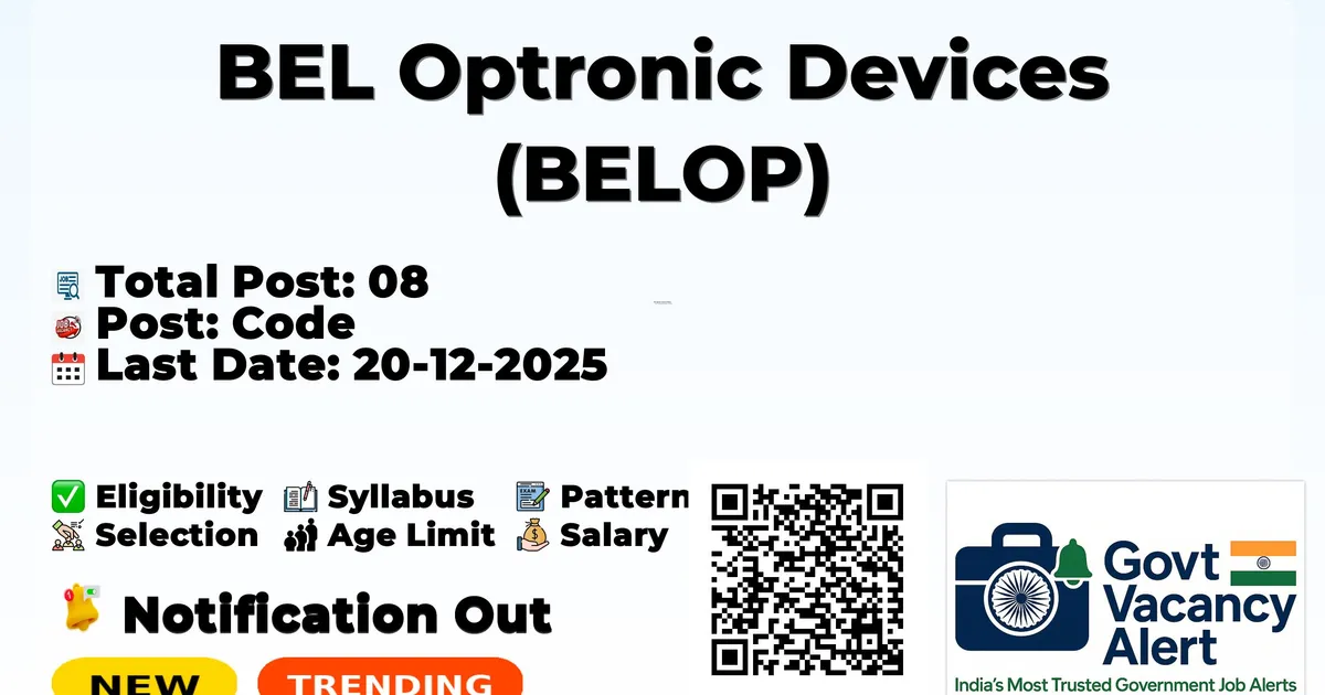Company Name BEL Optronic Devices (BELOP) Post Name Engineers (Various) No of Posts 08 Salary 23,500 to 1,20,000 Qualification B.Tech/B.E in relevant discipline Age Limit 30 years Last Date for Apply 20-12-2025 Official Website belop-india.in