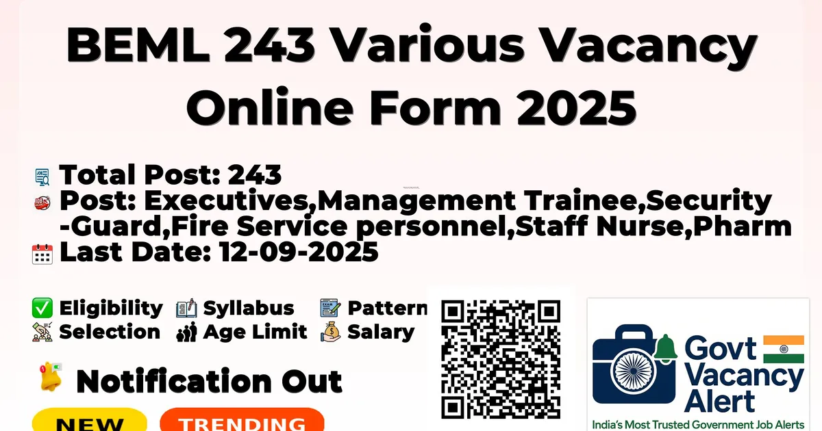 The Bharat Earth Movers (BEML) Recruitment 2025 for 243 posts of Security Guard, Staff Nurse and More. Candidates with B.Sc, B.Tech/B.E, ITI, 10TH, CA, M.A, MBA/PGDM, PG Diploma, M.Phil/Ph.D, MSW Can Apply Online. The online application closes on 12-09-2025. The candidate shall apply online through BEML website, bemlindia.in.