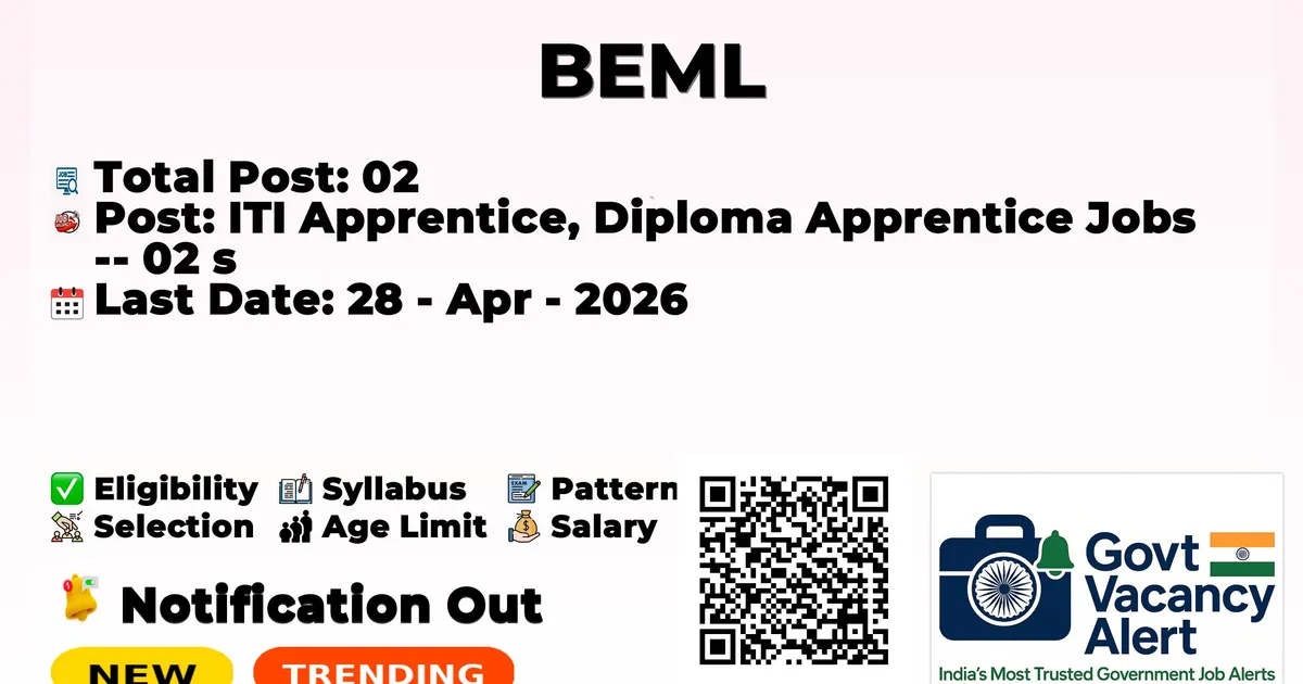 The Bharat Earth Movers Limited (BEML) has officially released the notification to fill the vacancies of 02 ITI Apprentice and Diploma Apprentice Jobs. Interested and eligibile candidates can use this opportunity to apply for these posts before the last date of application. Candidates who have completed their ITI, Diploma in Electrical, and Mechanical Engineering can apply for the BEML Notification 2026. The interested applicants can apply in online mode. Here we have mentioned the education details, age limit, selection process, application fee, salary, and how to apply for these posts before the deadline. The application dates have already begun.