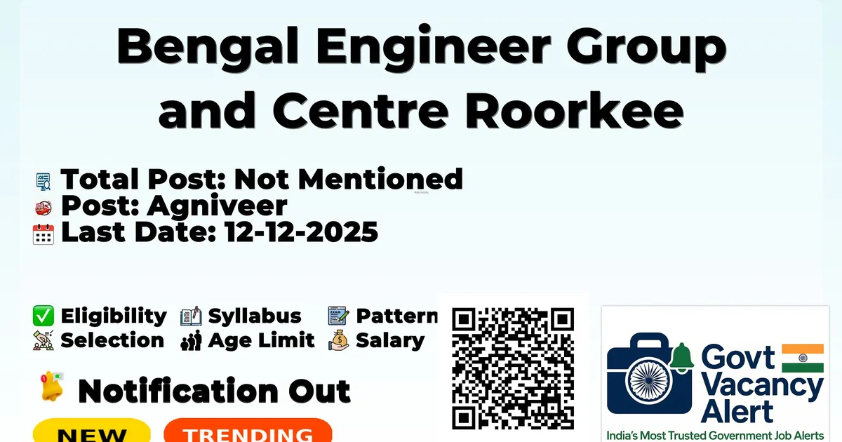 Bengal Engineer Group and Centre Roorkee has released an official notification for the recruitment of Not Mentioned Agniveer Posts. Interested and eligible candidates can apply Offline through the official Bengal Engineer Group and Centre Roorkee website. The last date to submit the application form is 12-12-2025. In this article, you’ll find the Bengal Engineer Group and Centre Roorkee Agniveer Posts recruitment details, including eligibility criteria, age limit, salary structure, selection process, application steps, and direct links to the official notification and Offline application form.