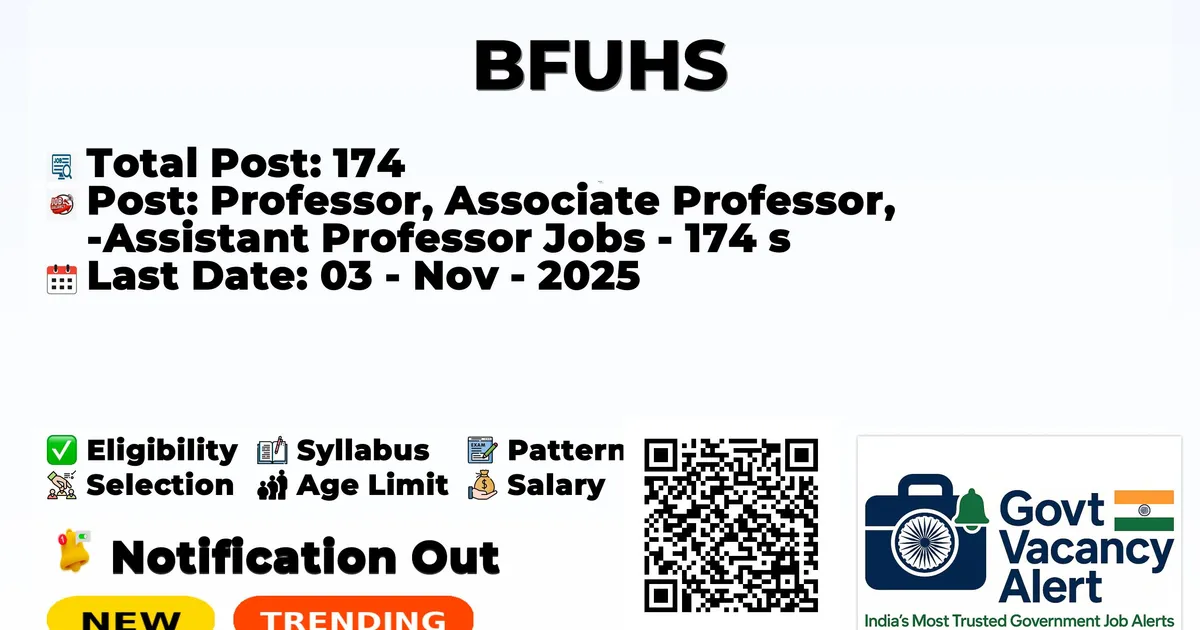 Baba Farid University of Health Science (BFUHS) has declared the latest job notification for 2025. To fill up the vacancies for 174 Professor, Associate Professor, and Assistant Professor Jobs. Those candidates who have qualified in the MD/ MS, DNB, M.Sc, MDS, M.Ch, and Ph.D can grab this chance and apply for these posts. Here, we mentioned the age limit, selection process, salary structure, education details, application fee, and how to apply for the BFUHS Jobs 2025. Interested and eligible candidates can apply online through the website on or before the last date of application.
