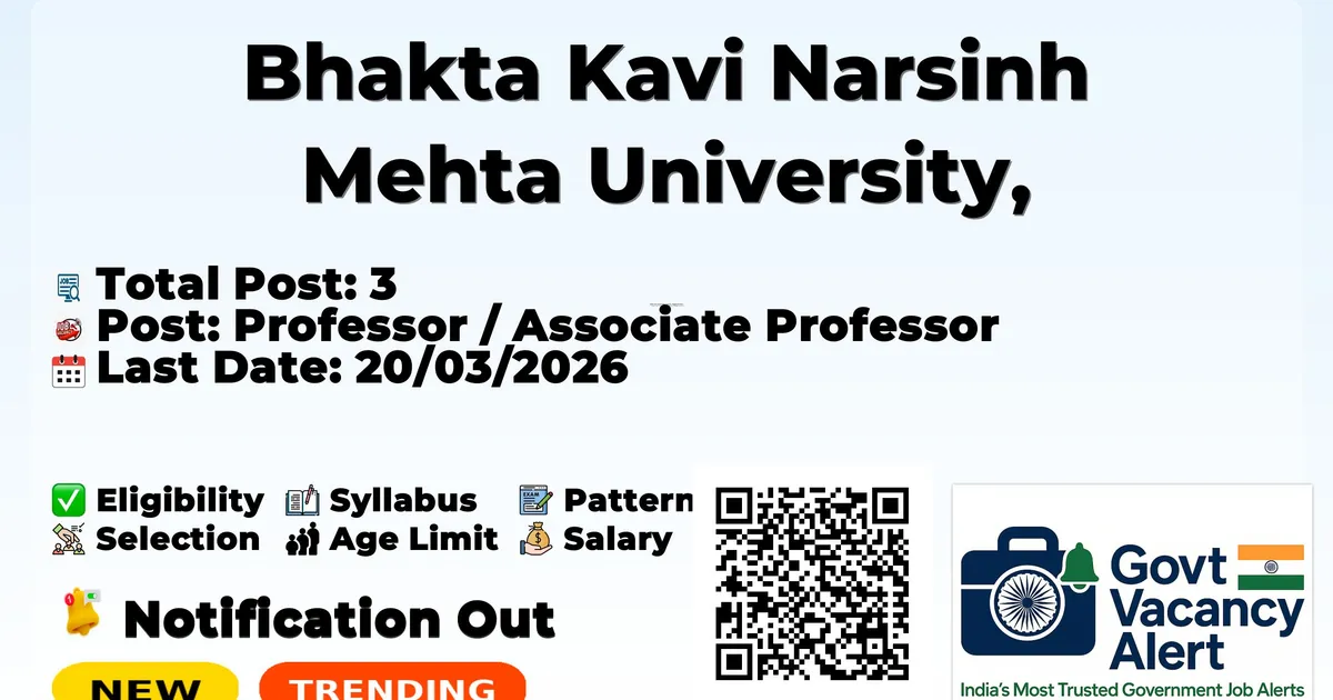 Bhakta Kavi Narsinh Mehta University Junagadh (BKNMU) has released an official notification for the recruitment of 03 Professor, Associate Professor Posts. Interested and eligible candidates can apply Online through the official BKNMU website. The last date to submit the application form is 20-03-2026. In this article, you’ll find the BKNMU Professor, Associate Professor Posts recruitment details, including eligibility criteria, age limit, salary structure, selection process, application steps, and direct links to the official notification and Online application form.