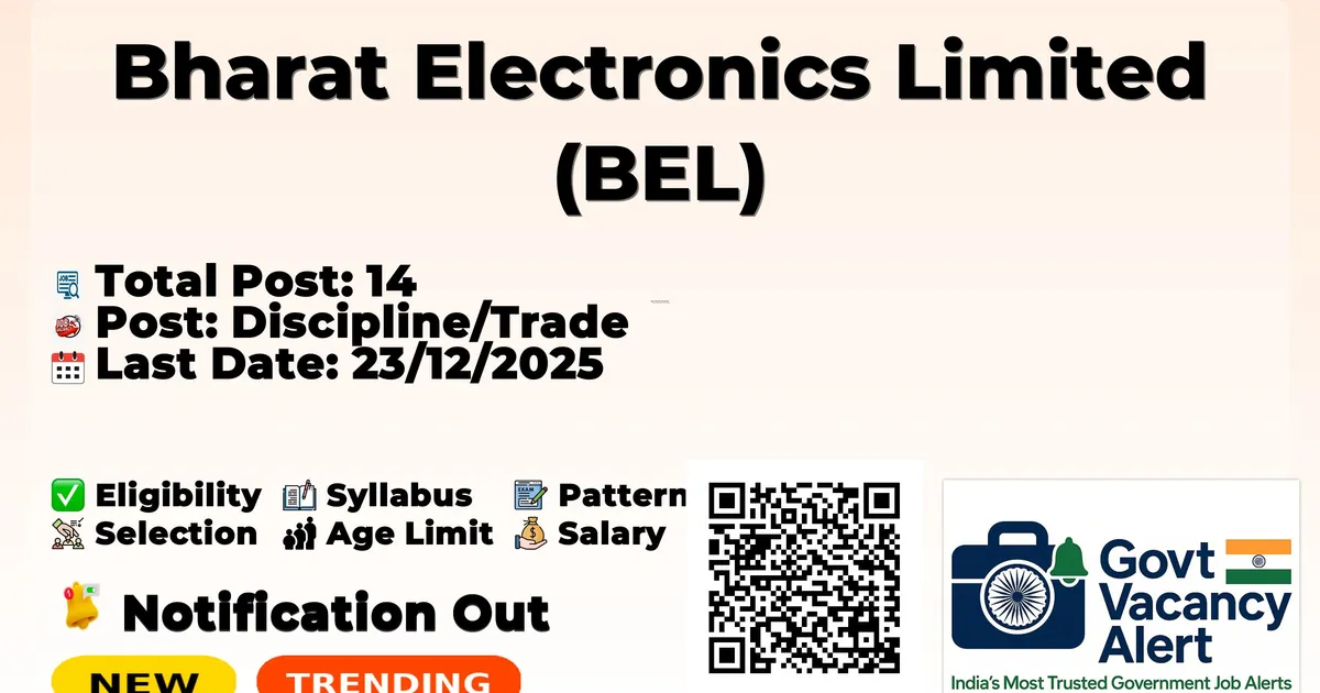 Bharat Electronics (BEL) has released an official notification for the recruitment of 14 Engineering Assistant Trainee, Technician C Posts. Interested and eligible candidates can apply Online through the official BEL website. The last date to submit the application form is 23-12-2025. In this article, you’ll find the BEL Engineering Assistant Trainee, Technician C Posts recruitment details, including eligibility criteria, age limit, salary structure, selection process, application steps, and direct links to the official notification and Online application form. Join Arattai Channel Trending Govt Jobs SSC 25487 GD Constable Online Form 2025 OICL 300 AO Online Form 2025 RRB NTPC 12TH Level Online Form 2025 3058 Post Intelligence Bureau (IB) 362 MTS Online Form 2025 RRB 2569 JE (Junior Engineer) Online Form 2025 Advertisement Company Name Bharat Electronics Limited (BEL) Post Name Engineering Assistant Trainee (EAT) & Technician ‘C’ No of Posts 14 Salary ₹21,500-82,000 & ₹24,500-90,000 + admissible allowances Per Month Qualification 3 years Diploma in Engineering / SSLC+ITI+1 year Apprenticeship (NAC) Age Limit 18 to 28 years (as on 01/12/2025) Start Date for Apply 02/12/2025 Last Date for Apply 23/12/2025 Official Website https://www.bel-india.in Post Name Discipline/Trade Total Posts Reservation Engineering Assistant Trainee (EAT) Electronics 06 UR-02, OBC-01, EWS-01, SC-02 Mechanical 03 UR-02, OBC-01 Electrical 01 UR-01 Technician ‘C’ Electronic Mechanic 02 UR-01, EWS-01 Fitter 01 UR-01 Machinist 01 SC-01 Grand Total 14 - Candidate must be a citizen of India Minimum age 18 years Valid & active registration in Uttarakhand Employment Exchange as on 23.12.2025 is mandatory For EAT: 3 years Diploma in Electronics / Mechanical / Electrical Engineering For Technician ‘C’: SSLC + ITI + 1 year apprenticeship (NAC) in Electronic Mechanic / Fitter / Machinist Minimum 60% marks (50% for SC/PwBD) in qualifying exam for General/OBC/EWS candidates Maximum Age for General/EWS: 28 Years Age Relaxation: OBC (NCL): 3 years SC/ST: 5 years PwBD (minimum 40% disability): 10 years (additional relaxation over SC/ST/OBC) Engineering Assistant Trainee (EAT): During 6 months training: Stipend ₹24,000/- per month After successful training: ₹24,500 – 3% – ₹90,000 + admissible allowances Technician ‘C’: ₹21,500 – 3% – ₹82,000 + admissible allowances Notification Date 02/12/2025 Starting Date to Apply Online 02/1/2025 Last Date to Apply Online 23/12/2025 Computer Based Test To be notified (at Dehradun & Haldwani only) Computer Based Test (150 marks) Part I: General Aptitude – 50 marks Part II: Technical/Professional Knowledge – 100 marks Document Verification Final selection based on merit in CBT Apply Link: Click here Official Notification PDF: Click here Official Website: Click here Join Arattai Channel: Click Here Join Telegram Channel: Click Here Join WhatsApp Channel: Click Here Sarkari Result: Click Here Download Mobile App: Click Here Jobs In Uttarakhand Almora Bageshwar Chamoli Champawat Dehradun Haldwani Haridwar Nainital Pauri Garhwal Pithoragarh Roorkee Rudraprayag Rudrapur Srinagar(Garhwal) Tehri Garhwal Udham Singh Nagar Uttarkashi Also Read Territorial Army Rally Recruitment 2025 - 1500+ Vacancies - 8TH, 10TH, 12TH Pass Candidates Can Apply AIIMS CRE Recruitment 2025 - 1300+ Group B and Group C Posts - Apply Link Click Here RRB Recruitment 2025 - 2500+ JE (Junior Engineer) Vacancies - 35400 Monthly Salary - Apply Now Jobs By Education 10TH Jobs› 8TH Jobs› 12TH Jobs› Diploma Jobs› ITI Jobs› B.Tech/B.E Jobs› B.com Jobs› Any Graduate Jobs› Any Post Graduate Jobs› SSC 25487 GD Constable Online Form 2025 IBPS RRB Clerk Admit Card 2025 RRB Group D Admit Card 2025 EMRS Teaching and NonTeaching Admit Card 2025 Delhi Police Head Constable (Ministerial) Admit Card 2025 IOCL 2,756 Apprentices Online Form 2025 RRB NTPC 12TH Level Online Form 2025 3058 Post Intelligence Bureau (IB) 362 MTS Online Form 2025 RRB 2569 JE (Junior Engineer) Online Form 2025 1. What is the last date to apply for BEL Kotdwara Recruitment 2025? Ans: Last date to apply is 23/12/2025. 2. How many vacancies are there in BEL Kotdwara 2025? Ans: Total 14 vacancies. 3. What is the age limit for BEL EAT & Technician posts? Ans: Maximum 28 years as on 01/12/2025. 4. What is the selection process for BEL Kotdwara Recruitment? Ans: Computer Based Test (150 marks) followed by Document Verification. 5. Is Uttarakhand Employment Exchange registration compulsory? Ans: Yes, valid and active registration as on 23.12.2025 is mandatory. 6. What is the salary of Engineering Assistant Trainee in BEL? Ans: ₹24,000 stipend during training, then ₹24,500-90,000 + allowances.