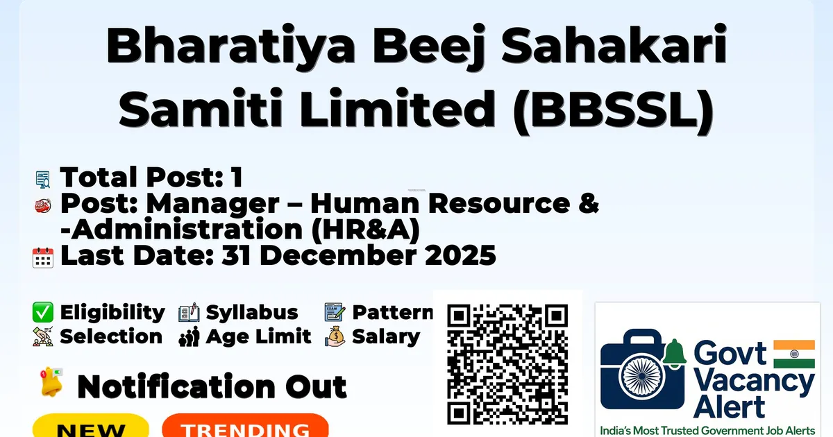Bharatiya Beej Sahakari Samiti (BBSSL) has released an official notification for the recruitment of Manager Posts. Interested and eligible candidates can apply Offline through the official BBSSL website. The last date to submit the application form is 31 December 2025. In this article, you’ll find the BBSSL Manager Posts recruitment details, including eligibility criteria, age limit, salary structure, selection process, application steps, and direct links to the official notification and Offline application form.