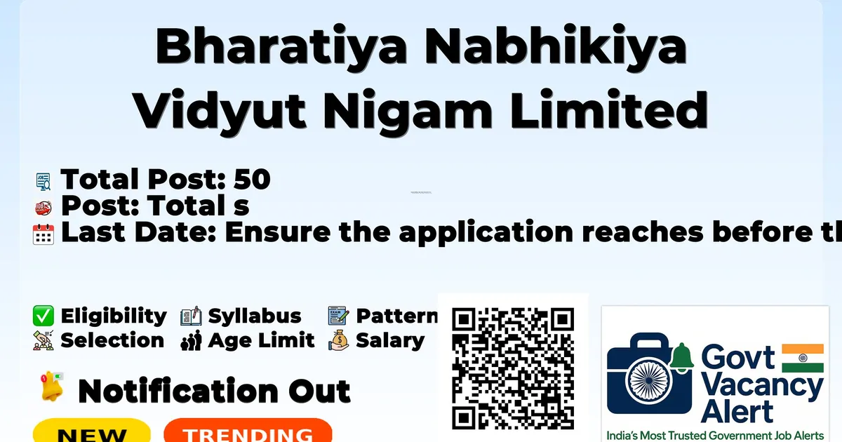 Company Name Bharatiya Nabhikiya Vidyut Nigam Limited (BHAVINI) Post Name Trade Apprentice No of Posts 50 Advt No BHAVINI/HR/TA-IV/2026 - 2027 Salary Rs. 9600 Per Month Qualification 10th pass + ITI in relevant trade Age Limit Min: 16 years, Max: 24 years Last Date 16-03-2026 Apply Mode Offline Job Type Contractual