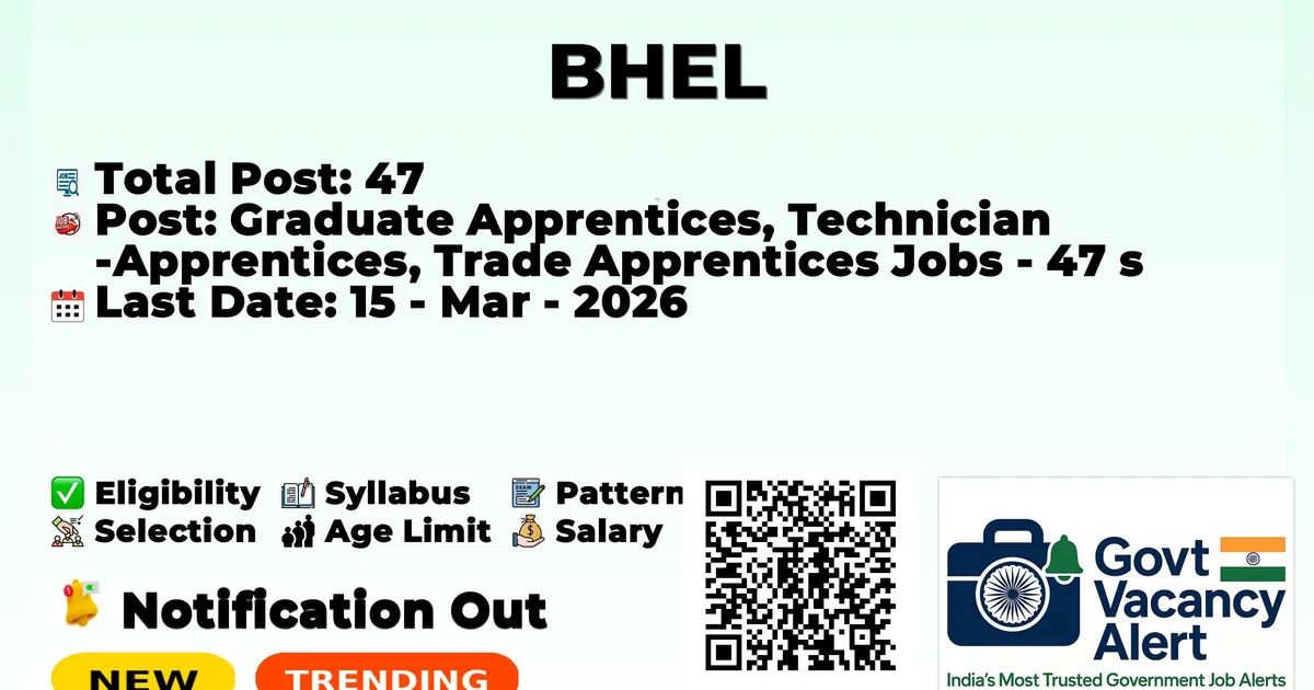 The Bharat Heavy Electricals (BHEL Jhansi) has officially released the notification to fill the vacancies of 47 Graduate Apprentices, Technician Apprentices, and Trade Apprentices. Interested and eligible candidates can use this opportunity to apply for these posts before the last date of application. Candidates who have completed their 10th pass, ITI, B.E./B. Tech in Mechanical, Electrical Engineering, and Diploma can apply for the BHEL Jhansi Jobs 2026. The interested applicants can apply in online mode. Here we have mentioned the education details, age limit, selection process, application fee, salary, and how to apply for these posts before the deadline. The application dates have already begun.