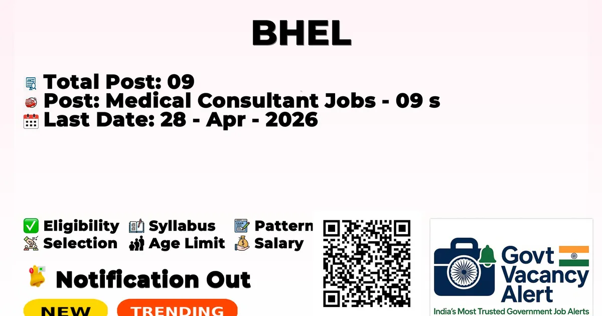 Bharat Heavy Electricals Limited (BHEL) has declared the official notification for 2026. To fill up the vacancies for 09 Medical Consultant Jobs. Those candidates who have qualified for MBBS can grab this opportunity and apply for the BHEL Notification 2026. Here, we included the age limit, selection process, and salary structure, education details, application fee, and how to apply for these posts.