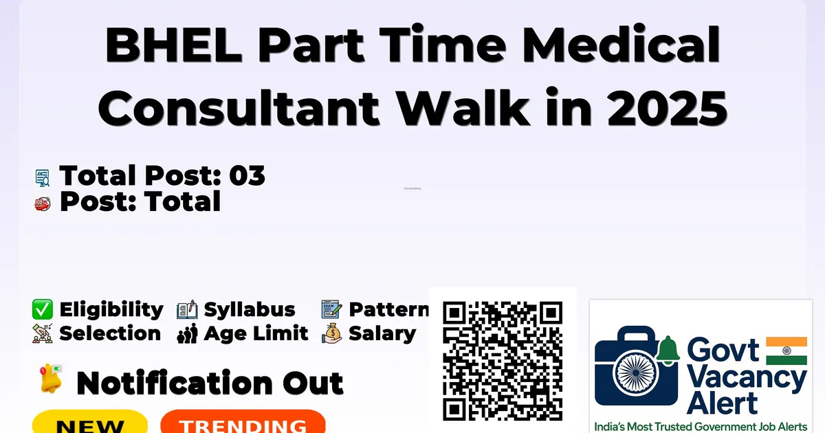 Bharat Heavy Electricals (BHEL) Recruitment 2025 for 03 posts of Part Time Medical Consultant. Candidates with Diploma, PG Diploma Can attend the walkin. The Walk-in starts from 18-11-2025, and ends on 20-11-2025. For detailed information please visit BHEL official website, bhel.in.