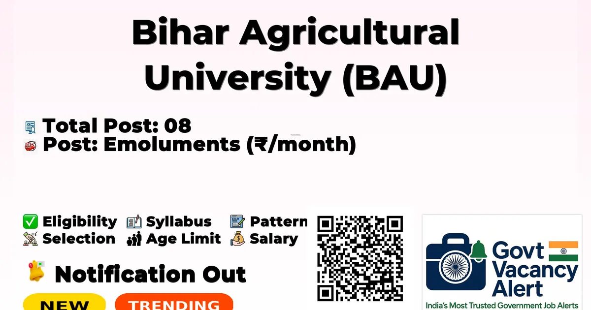 Join Arattai Channel Trending Govt Jobs SSC 25487 GD Constable Online Form 2025 OICL 300 AO Online Form 2025 RRB NTPC 12TH Level Online Form 2025 3058 Post Intelligence Bureau (IB) 362 MTS Online Form 2025 RRB 2569 JE (Junior Engineer) Online Form 2025 Advertisement Bihar Agricultural University (BAU Bhagalpur) Recruitment 2025 for 08 posts of Research Associate, Technical Assistant and Other. Candidates with M.Phil/Ph.D Can attend the walkin. The Walk-in interview on 17-12-2025. For detailed information please visit BAU Bhagalpur official website, bausabour.ac.in. Company Name Bihar Agricultural University (BAU) Post Name Research Associate, Young Professional-II, Technical Assistant No of Posts 08 Salary ₹30,000/- to ₹70,000/- + HRA per month (post-wise) Qualification Ph.D./Master’s/Bachelor’s in relevant discipline (Computer Science, Remote Sensing, GIS, Geo-informatics, etc.) + experience as per post Walkin Date 17/12/2025 Official Website https://bausabour.ac.in Post Name Category Vacant Positions Research Associate (RA) 01-UR, 01-EBC 02 Young Professional-II (YP-II) 01-EBC, 02-UR, 01-SC 04 Technical Assistant (TA) 01-UR, 01-EBC 02 Research Associate (RA): Ph.D. in Computer Science/Computer Applications/Geo-informatics/Remote Sensing & GIS/Geospatial Science/Data Science OR Master’s (MCA/M.Tech) in relevant field with at least 5 years experience Young Professional-II (YP-II): Master’s degree in Remote Sensing/Geo-informatics/Geospatial Science/Geography/Computer Science OR M.Tech equivalent with 2 years experience Technical Assistant (TA): Graduation degree Post Name Emoluments (₹/month) Research Associate (RA) 70,000 + HRA Young Professional-II (YP-II) 42,000 (Fixed) Technical Assistant (TA) 30,000 (Fixed) Tentative date & time of Interview: 17.12.2025 (10.00 AM) Notification Click here Official Website Click here Free Mock Test Click Here Sarkari Result Click Here Join Telegram Channel Click Here Download Mobile App Click Here Join WhatsApp Channel Click Here Jobs In Bihar Araria Arwal Aurangabad Bihar Banka Begusarai Bhagalpur Bhojpur Buxar Darbhanga Gaya Gopalganj Jamui Jehanabad Kaimur Katihar Khagaria Kishanganj Lakhisarai Madhepura Madhubani Munger Muzaffarpur Nalanda Nawada Pashchim Champaran Patna Purbi Champaran Purnia Rohtas Saharsa Samastipur Saran Sheikhpura Sheohar Sitamarhi Siwan Supaul Vaishali Also Read Territorial Army Rally Recruitment 2025 - 1500+ Vacancies - 8TH, 10TH, 12TH Pass Candidates Can Apply AIIMS CRE Recruitment 2025 - 1300+ Group B and Group C Posts - Apply Link Click Here RRB Recruitment 2025 - 2500+ JE (Junior Engineer) Vacancies - 35400 Monthly Salary - Apply Now Jobs By Education 10TH Jobs› 8TH Jobs› 12TH Jobs› Diploma Jobs› ITI Jobs› B.Tech/B.E Jobs› B.com Jobs› Any Graduate Jobs› Any Post Graduate Jobs› CISF Tradesmen Admit Card 2025 Maharashtra 15631 Police Constable Online Form 2025 SBI 996 SCO Online Form 2025 EMRS Teaching and NonTeaching Admit Card 2025 SSC 25487 GD Constable Online Form 2025 IBPS RRB Clerk Admit Card 2025 RRB Group D Admit Card 2025 Delhi Police Head Constable (Ministerial) Admit Card 2025 IOCL 2,756 Apprentices Online Form 2025 1. What is the date of Walk-in-Interview? Ans: 17/12/2025 at 10:00 AM 2. What is the venue of the interview? Ans: Office of the Director Research, Bihar Agricultural University, Sabour, Bhagalpur-813210 3. How many total vacancies are there? Ans: Total 08 vacancies (RA: 02, YP-II: 04, TA: 02) 4. What is the salary for Research Associate? Ans: ₹70,000 + HRA per month 5. What is the salary for Young Professional-II? Ans: ₹42,000 (Fixed) per month 6. What is the salary for Technical Assistant? Ans: ₹30,000 (Fixed) per month 7. Is any age limit mentioned? Ans: No age limit specified in the notification 8. Will TA/DA be paid for attending interview? Ans: No TA/DA will be paid 9. What is the nature of engagement? Ans: Purely temporary & co-terminus with the project (minimum 06 months, extendable on performance) 10. How to apply? Ans: Bring complete Bio-data + all original documents and appear for Walk-in-Interview on 17.12.2025 Join Arattai Channel Trending Govt Jobs SSC 25487 GD Constable Online Form 2025 OICL 300 AO Online Form 2025 RRB NTPC 12TH Level Online Form 2025 3058 Post Intelligence Bureau (IB) 362 MTS Online Form 2025 RRB 2569 JE (Junior Engineer) Online Form 2025 Advertisement