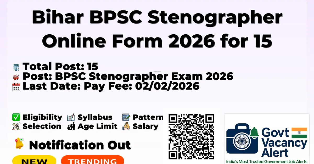 BPSC Stenographer Recruitment 2026: Bihar Public Service Commission (BPSC) are invited to apply online application form for Bihar BPSC Stenographer Online Form 2026. Other information related to this recruitment like selection procedure, pay scale, age limit, syllabus information is available in the notification (Bihar BPSC Stenographer Online Form 2026 for 15 Post).