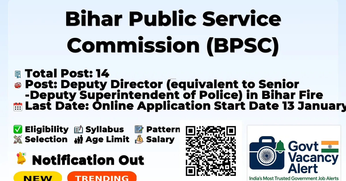Company Name Bihar Public Service Commission (BPSC) Post Name Deputy Director (equivalent to Senior Deputy Superintendent of Police) in Bihar Fire Service No of Posts 14 Salary Revised Pay Level-11 Qualification Bachelor from Science faculty or Bachelor (Fire Engineering) or Engineering Bachelor in Mechanical/Automobile + Divisional Officer Course from National Fire College, Nagpur OR minimum 3 months senior supervisory training from recognized institutions. Age Limit 40 to 55 years Start Date 13 January 2026 Last Date 03 February 2026 Official Website www.bpsc.bihar.gov.in