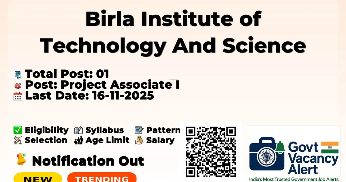 Birla Institute of Technology And Science Pilani (BITS Pilani) has released an official notification for the recruitment of 01 Project Associate I Posts. Interested and eligible candidates can apply Online through the official BITS Pilani website. The last date to submit the application form is 16-11-2025. In this article, you’ll find the BITS Pilani Project Associate I Posts recruitment details, including eligibility criteria, age limit, salary structure, selection process, application steps, and direct links to the official notification and Online application form.