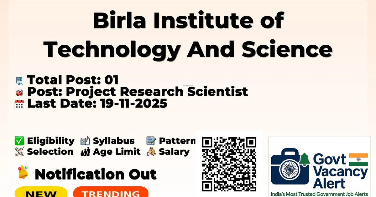 Birla Institute of Technology And Science Pilani (BITS Pilani) has released an official notification for the recruitment of 01 Project Research Scientist Posts. Interested and eligible candidates can apply Online through the official BITS Pilani website. The last date to submit the application form is 19-11-2025. In this article, you’ll find the BITS Pilani Project Research Scientist Posts recruitment details, including eligibility criteria, age limit, salary structure, selection process, application steps, and direct links to the official notification and Online application form. Join Arattai Channel Trending Govt Jobs SAIL 124 Management Trainee (Tech) Online Form 2025 KVS and NVS Online Form 2025 RRB NTPC 5,810 Online Form 2025 Bank of Baroda 2700 Apprentices Online Form 2025 Intelligence Bureau (IB) ACIO II Tech Online Form 2025 Advertisement Company Name Birla Institute of Technology And Science Pilani (BITS Pilani) Post Name Project Research Scientist No of Posts 01 Salary Rs. 56,000 Qualification Any Post Graduate, M.Phil/Ph.D Start Date for Apply Online 11-11-2025 Last Date for Apply Online 19-11-2025 Official Website bits-pilani.ac.in First-class postgraduate degree including the integrated PG degree or Second-class postgraduate degree, including the integrated PG degree with Ph.D. in the area of Biotechnology/ Microbiology/Biochemistry/Molecular Biology from reputed University/Institute Fellowship Amount (Rs.): 56,000/- pm + HRA 18% Starting Date for Apply Online: 11-11-2025 Last Date for Apply Online: 19-11-2025 Only shortlisted candidates will be contacted via e-mail for interview. Interested candidates may send application and curriculum vitae with details of research experience to the principal investigator (email: [email protected]) by 19-Nov-2025. Use the subject line as ‘ICMR application_your name’ Official Notification PDF: Click here Official Website: Click here Join Arattai Channel: Click Here Join Telegram Channel: Click Here Join WhatsApp Channel: Click Here Sarkari Result: Click Here Download Mobile App: Click Here Jobs In Goa North Goa Panaji South Goa Vasco Da Gama Also Read SEBI Recruitment 2025 - Officer Grade A (Assistant Manager) Vacancies - Rs 62500 to 126100 Salary - Apply Now Intelligence Bureau ACIO II Tech Recruitment 2025 - 200+ Vacancies Across India - 44900-142400 Salary - Apply Now RRB Recruitment 2025 - 2500+ JE (Junior Engineer) Vacancies - 35400 Monthly Salary - Apply Now Jobs By Education 10TH Jobs› 8TH Jobs› 12TH Jobs› Diploma Jobs› ITI Jobs› B.Tech/B.E Jobs› B.com Jobs› Any Graduate Jobs› Any Post Graduate Jobs› Bank of Baroda 2700 Apprentices Online Form 2025 RRB 2569 JE (Junior Engineer) Online Form 2025 RRB NTPC 12TH Level Online Form 2025 3058 Post BRO 542 MSW, Vehicle Mechanic Offline Form 2025 Territorial Army 1529 Soldier Offline Form 2025 ONGC 2623 Apprentices Online Form 2025 BSSC 23175 Inter Level Online Form 2025 ISRO SDSC SHAR Various Vacancy Online Form 2025 RRB NTPC 8850 Online Form 202526 1. What is the starting date to apply online for BITS Pilani Project Research Scientist 2025? Ans: Starting Date to apply online is 11-11-2025. 2. What is the last online apply date for BITS Pilani Project Research Scientist 2025? Ans: Last online apply date is 19-11-2025. 3. What is the Eligibility to apply for BITS Pilani Project Research Scientist 2025? Ans: Any Post Graduate, M.Phil/Ph.D 4. How many vacancies are being recruited by BITS Pilani Project Research Scientist 2025? Ans: Total 01 Vacancies.