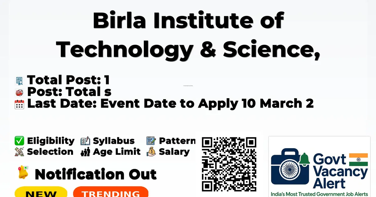 Birla Institute of Technology & Science, Pilani (BITS Pilani) has released an official notification for the recruitment of 1 Project Research Scientist-I (Non-Medical) Posts. Interested and eligible candidates can apply Online through the official BITS Pilani website. The last date to submit the application form is 10-03-2026.