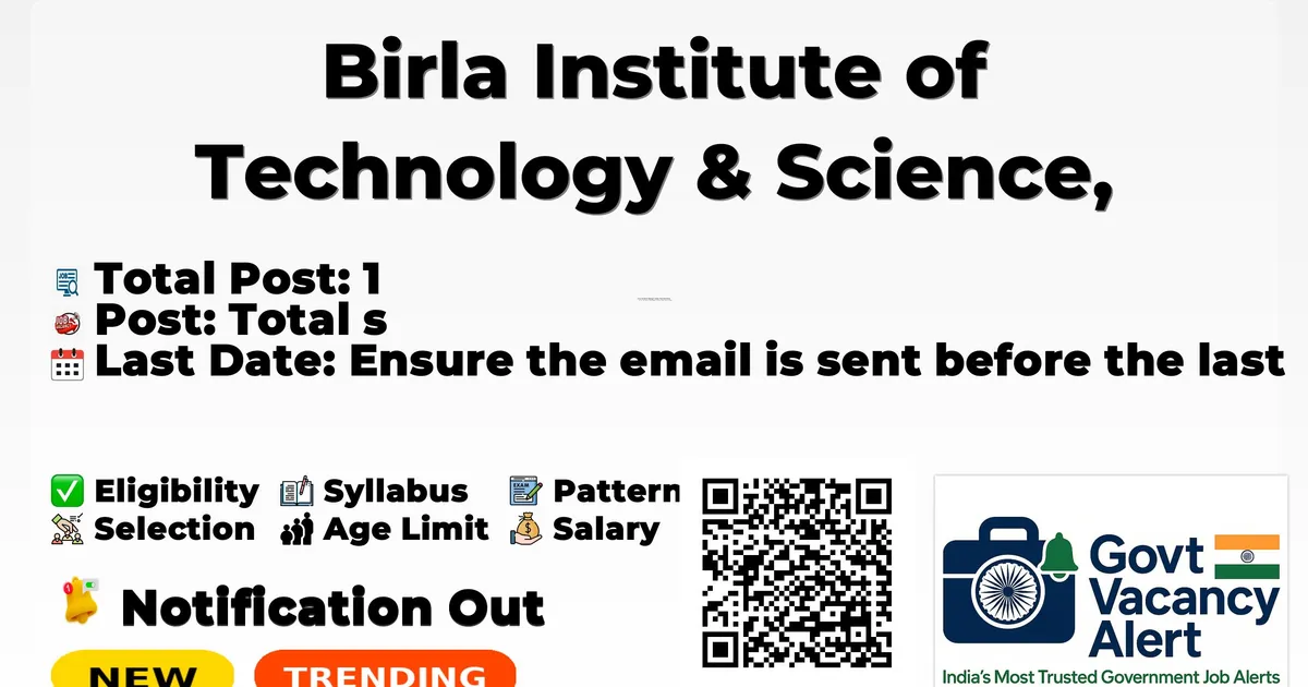 Birla Institute of Technology & Science, Pilani (BITS Pilani) has released an official notification for the recruitment of 1 Research Fellow Posts. Interested and eligible candidates can apply by sending their application via Email. The last date to send the application email is 12-03-2026. In this article, you'll find the Research Fellow recruitment details, including eligibility criteria, age limit, salary structure, selection process, email application procedure, and direct links to the official notification. Advertisement Company Name Birla Institute of Technology & Science, Pilani (BITS Pilani) Post Name Research Fellow No of Posts 1 Salary 40,000 Per Month Qualification M. E./ M. Tech in Chemical / Mechanical / Energy / Environment or equivalent with minimum 60% Marks. B. E. Chemical/Mechanical (with related experience and minimum 60% Marks also preferred. Last Date 12-03-2026 Apply Mode Email Job Type Project-based Candidates should download and read the BITS Pilani Jobs 2026 notification PDF carefully to check vacancy details, eligibility, age limit, and application instructions. The notification also includes important dates and selection process details. The direct download link is available in the Important Links section below. Download BITS Pilani Research Fellow Job 2026 Notification PDF Post Name Total Posts Research Fellow 1 Total 1 Trending Govt Jobs RBI 650 Assistant Online Form 2026 IDBI Bank Junior Assistant Manager Online Form 2026 Indian Army Agniveer Recruitment Rally Notification 2026 AIIMS NORCET 10 Online Form 2026 HPCL 731 Engineers, JEA and More Online Form 2026 Research Fellow: M. E./ M. Tech in Chemical / Mechanical / Energy / Environment or equivalent with minimum 60% Marks. B. E. Chemical/Mechanical (with related experience and minimum 60% Marks also preferred). Related experience preferred for B.E. candidates. No application fee is mentioned in the official notification. Please refer to the official notification for age limit details. Research Fellow: 40,000 per month (consolidated) Event Date Application Deadline 12 March 2026 Last Date to Apply 12 March 2026 Shortlisted candidates will be contacted via e-mail for online interview. Candidates who wish to apply for BITS Pilani Research Fellow Recruitment 2026 via email should follow the steps below. Read the official notification carefully before applying. Prepare your application with complete bio-data including personal details, educational qualifications, and experience. Attach self-attested copies of all required documents such as educational certificates, experience certificates, ID proof, and recent passport-size photographs. Clearly mention the post applied for in the subject line of the email. Send the complete application to the official email address mentioned in the notification. Ensure the email is sent before the last date: 12-03-2026. Keep a copy of the sent email for future reference. Link Description Link Official Notification PDF Click here Apply Email Click here Official Website Click here