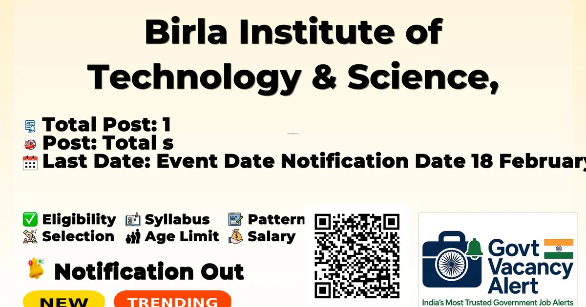 Birla Institute of Technology & Science, Pilani (BITS Pilani) has released an official notification for the recruitment of 1 Junior Research Fellow (JRF) Posts. Interested and eligible candidates can apply Online through the official BITS Pilani website. The last date to submit the application form is 28-02-2026.