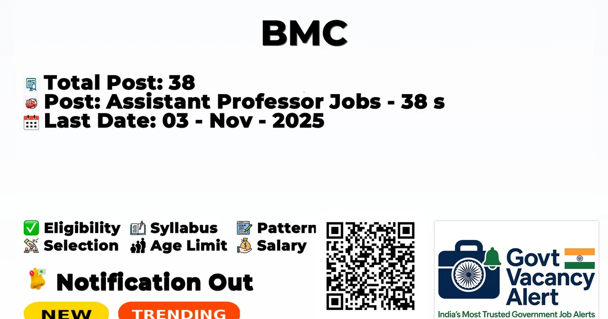 The Brihan Mumbai Municipal Corporation (BMC) has officially released the notification to fill the vacancies of 38 Assistant Professor Posts. Interested and eligibile candidates can use this opportunity to apply for these posts before the last date of application. Candidates who have completed their Post-graduation and Ph.D. can apply for the BMC Recruitment 2025. The interested applicants can apply in offline mode. Here we have mentioned the education details, age limit, selection process, application fee, salary, and how to apply for these posts before the deadline. The application dates have already begun.