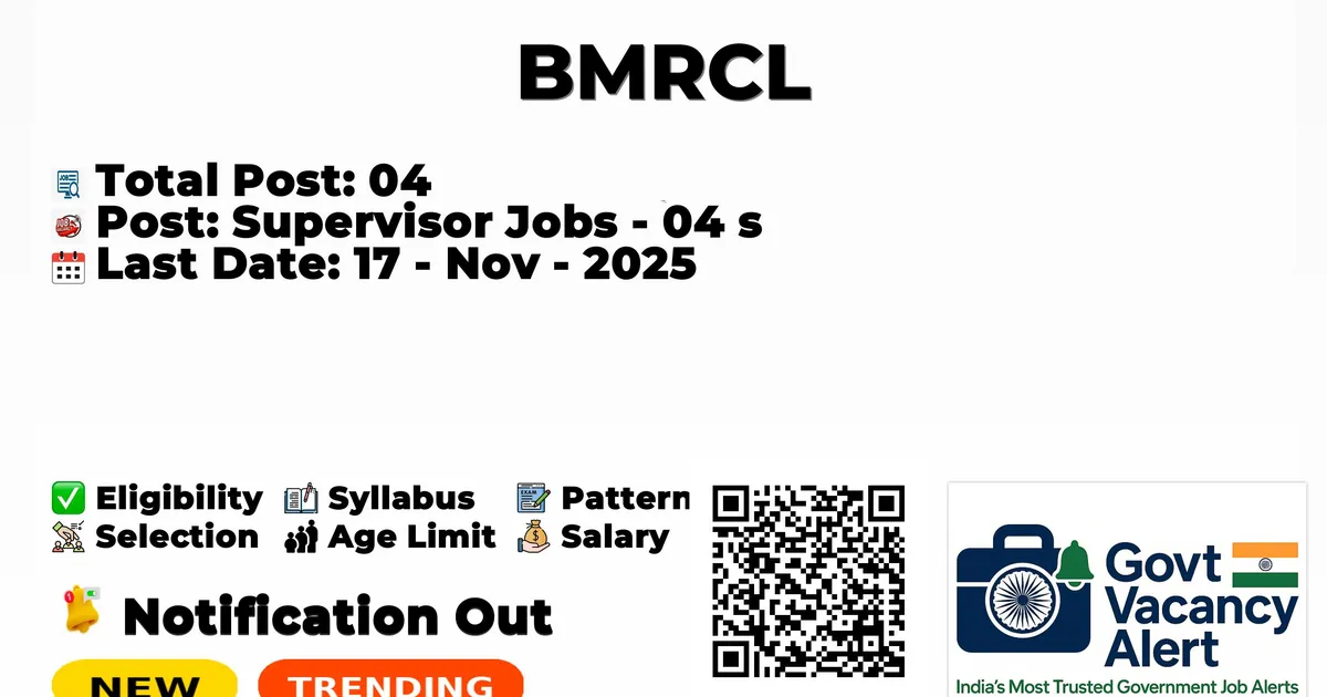 The Bangalore Metro Rail Corporation Limited (BMRCL) has officially released the notification to fill the vacancies of 04 Supervisor Posts. Interested and eligibile candidates can use this opportunity to apply for these posts before the last date of application. Candidates who have completed their Any Degree, Diploma, and B.E./B. Tech can apply for the BMRCL Notification 2025. The interested applicants can apply in online mode. Here we have mentioned the education details, age limit, selection process, application fee, pay scale, and how to apply for these posts before the deadline. The application dates have already begun.