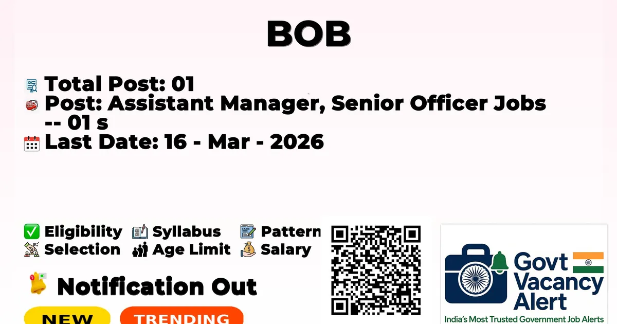 The BOB Financial Solutions (BOBCARD) has officially released the notification to fill the vacancies of 01 Assistant Manager/ Senior Officer Posts. Interested and eligibile candidates can use this opportunity to apply for these posts before the last date of application. Candidates who have completed their Any Degree, Post-graduation can apply for the BOBCARD Notification 2026. The interested applicants can apply in online mode. Here we have mentioned the education details, age limit, selection process, application fee, salary, and how to apply for these posts before the deadline. The application dates have already begun.