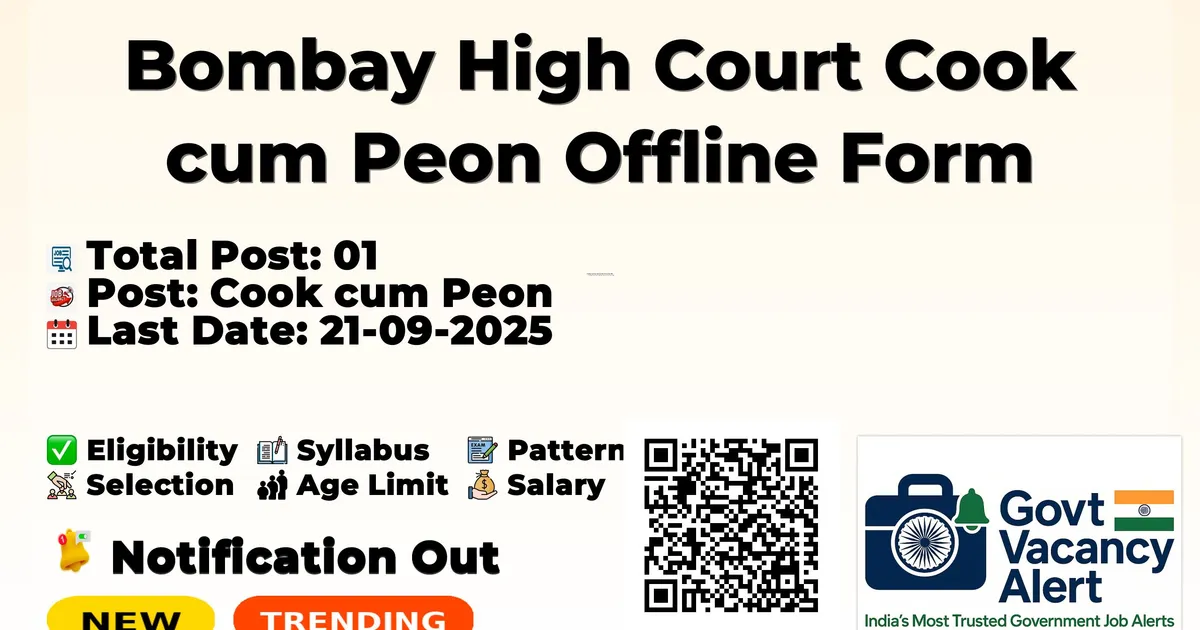 The Bombay High Court Recruitment 2025 for 01 posts of Cook cum Peon. Candidates with 7th Can Apply Offline. The Offline application opens on Available Soon, and closes on 21-09-2025. The candidate shall apply Offline through Bombay High Court website, bombayhighcourt.nic.in.
