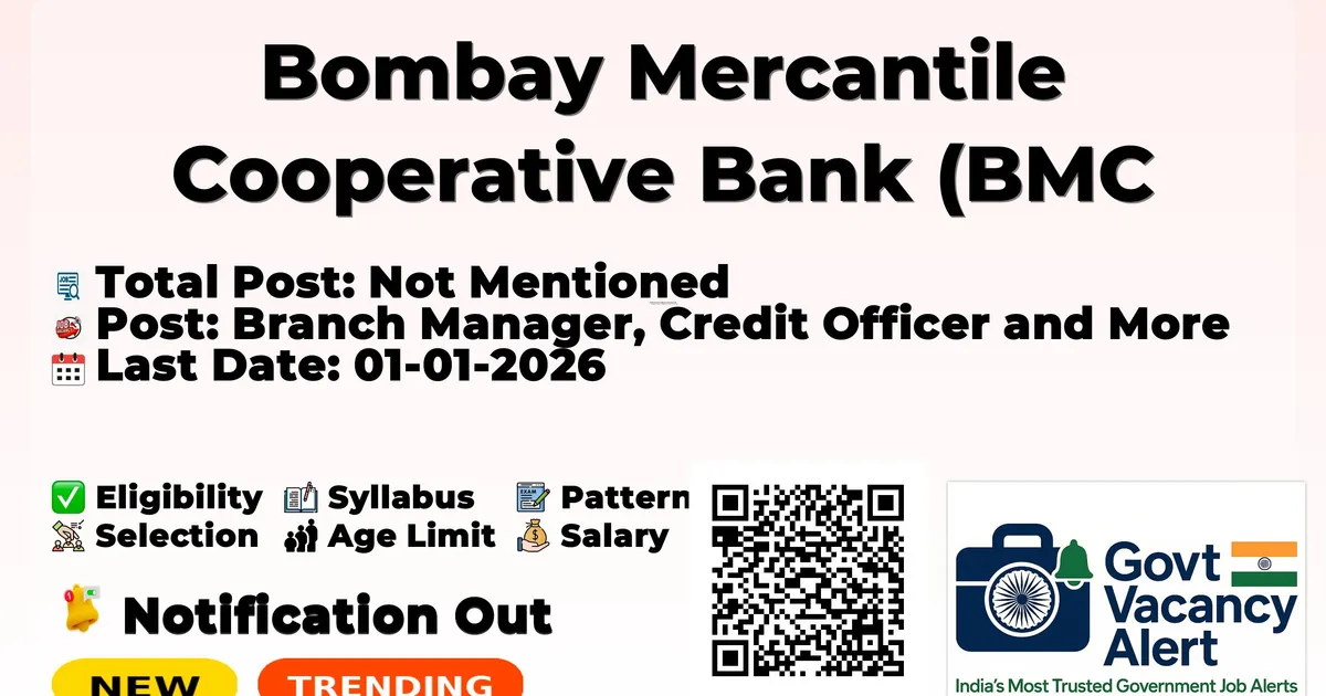Bombay Mercantile Cooperative Bank (BMC Bank) has released an official notification for the recruitment of Not Mentioned Branch Manager, Credit Officer and More Posts. Interested and eligible candidates can apply Online through the official BMC Bank website. The last date to submit the application form is 01-01-2026. In this article, you’ll find the BMC Bank Branch Manager, Credit Officer and More Posts recruitment details, including eligibility criteria, age limit, salary structure, selection process, application steps, and direct links to the official notification and Online application form.