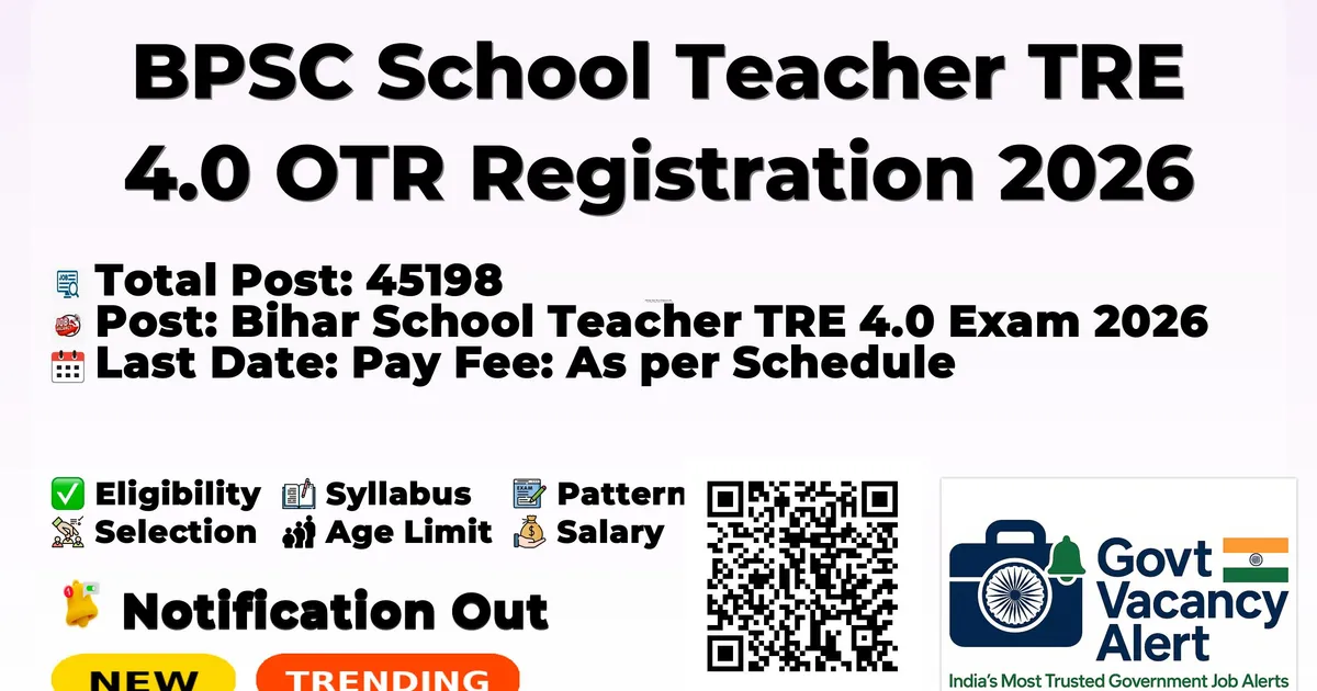 Bihar School Teacher TRE 4.0 Recruitment 2026: Bihar Public Service Commission (BPSC) are invited to apply online application form for BPSC Bihar School Teacher TRE 4.0 Recruitment 2026 Online Form. Other information related to this recruitment like selection procedure, pay scale, age limit, syllabus information is available in the notification (BPSC School Teacher TRE 4.0 OTR Registration 2026).