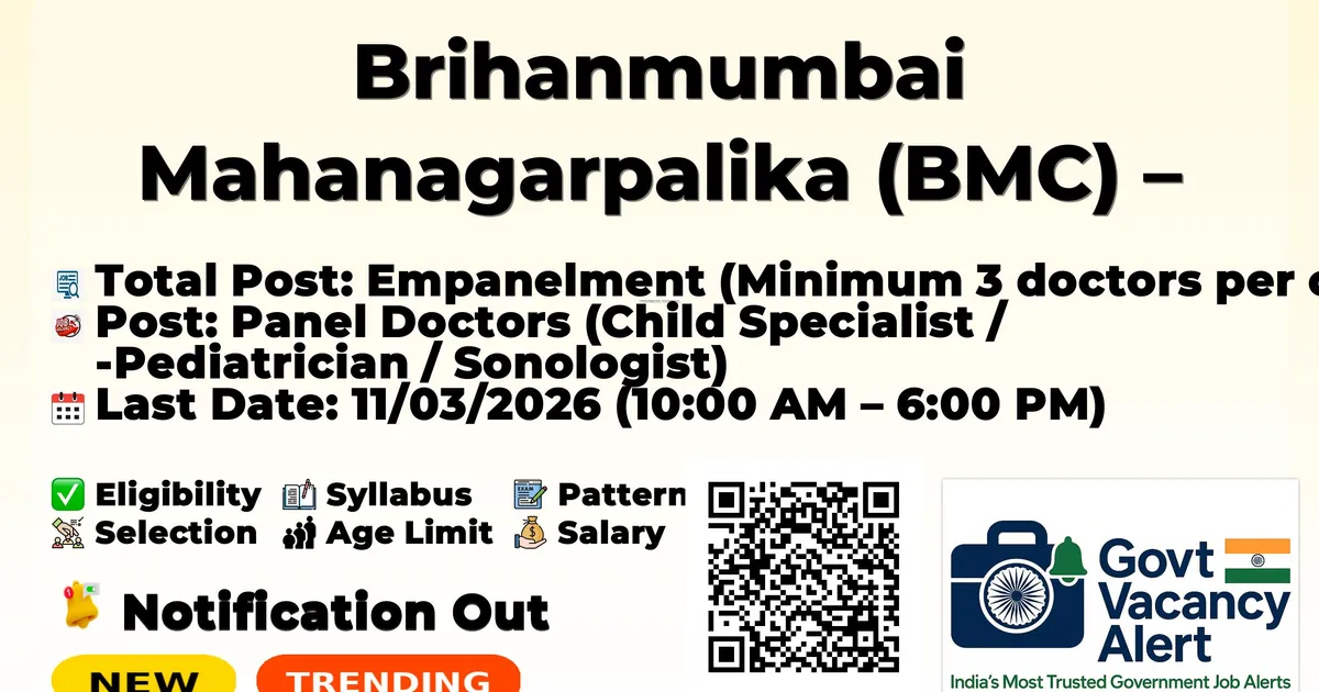 Company Name Brihanmumbai Mahanagarpalika (BMC) – Savitribai Phule Maternity and Child Hospital, Malad East Post Name Panel Doctors (Child Specialist / Pediatrician / Sonologist) No of Posts Empanelment (Minimum 3 doctors per category – No fixed vacancies) Advt No HO/700/ESP/NBHE dated 23.02.2026 Salary Honorarium: Small Hospital – Rs.1,850 (first 3 hrs) / Rs.300 per additional hr Big Hospital – Rs.3,500–6,000 (first 3 hrs) / Rs.550–1,400 per additional hr Qualification PG Degree/Diploma + 1 year experience + MMC Registration Age Limit Up to 65 years Start Date for Apply 25/02/2026 Last Date for Apply 11/03/2026 (10:00 AM – 6:00 PM) Official Website https://portal.mcgm.gov.in