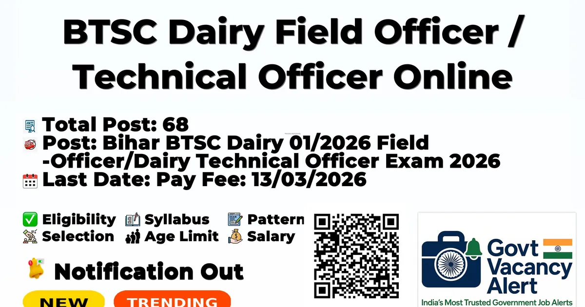Bihar BTSC Dairy 01/2026: Bihar Technical Service Commission (BTSC) are invited to apply online application form for Bihar BTSC Dairy Field Officer/Dairy Technical Officer Recruitment 2026. Other information related to this recruitment like selection procedure, pay scale, age limit, syllabus information is available in the notification (BTSC Dairy Field Officer / Technical Officer Online Form 2026).