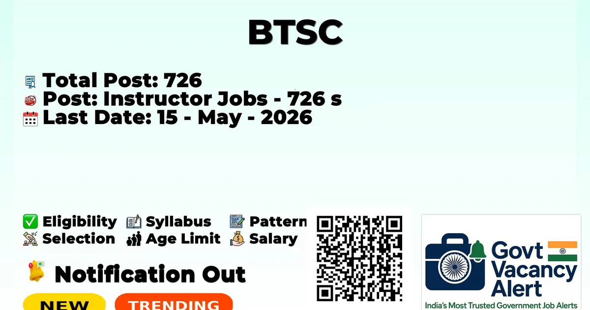 The Bihar Technical Service Commission (BTSC) has officially released the notification to fill the vacancies of 726 Instructor Posts. Interested and eligibile candidates can use this opportunity to apply for these posts before the last date of application. Candidates who have completed their Any Degree, Diploma, and ITI can apply for the BTSC Notification 2026. The interested applicants can apply in online mode. Here we have mentioned the education details, age limit, selection process, application fee, salary, and how to apply for these posts before the deadline. The application dates have already begun.