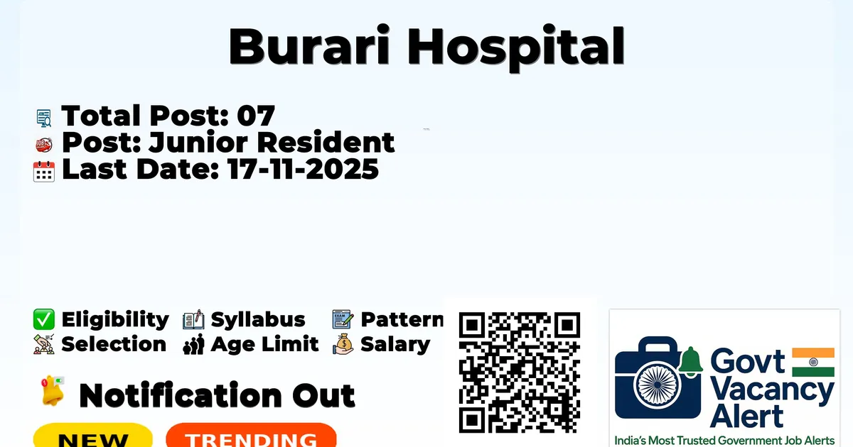 Company Name Burari Hospital Post Name Junior Resident No of Posts 07 Advt No BH/Resident/Advt-03/JR/11/2025 Qualification MBBS Age Limit 30 years Last Date for Apply Online 17-11-2025 Official Website health.delhi.gov.in