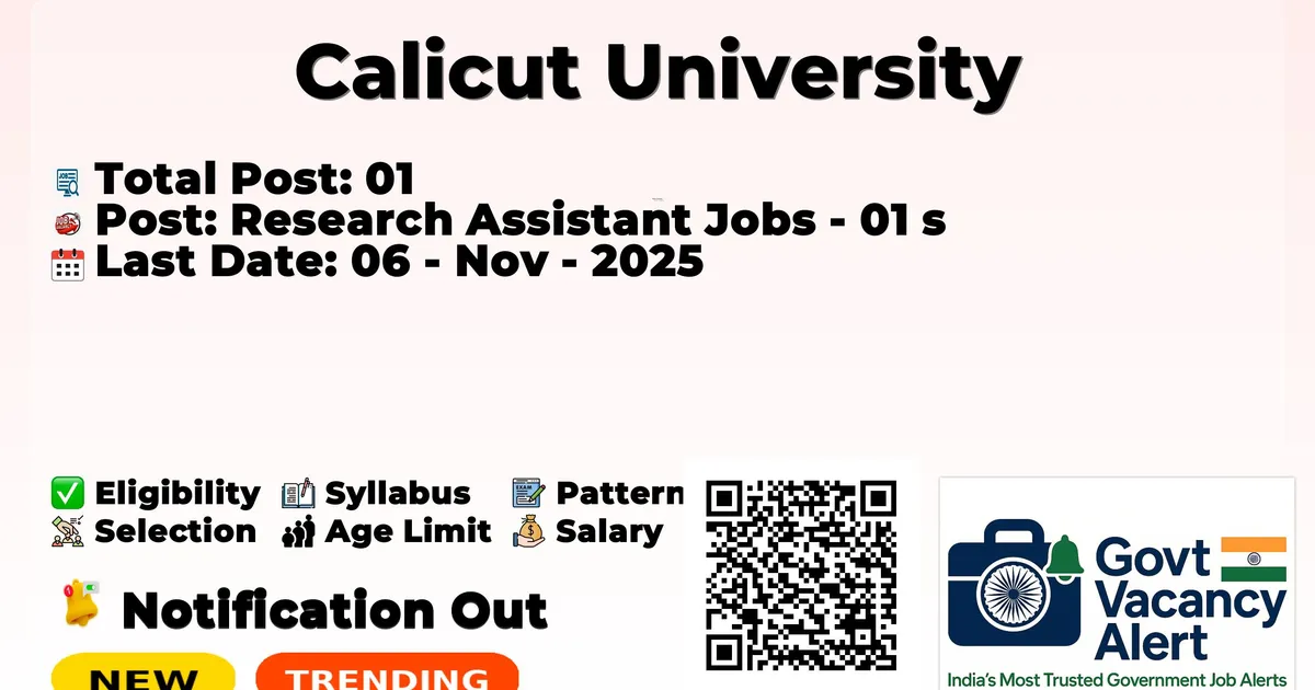 Calicut University has declared the official notification for 2025. To fill up the vacancies for Research Assistant Jobs. Those candidates who have qualified in the Post-Graduation can grab this chance and apply for these posts. Here, we provided more information about the age limit, selection process, salary structure, education details, application fee, and how to apply for the Calicut University Recruitment 2025. Interested and eligible candidates can attend the walk-in at the address given below.