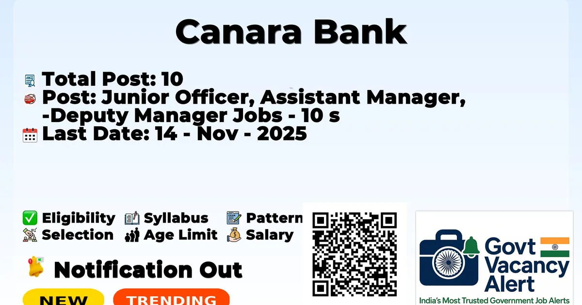 The Canara Bank Securities Limited (Canara Bank Securities) has officially released the notification to fill the vacancies of 10 Junior Officer Posts. Interested and eligibile candidates can use this opportunity to apply for these posts before the last date of application. Candidates who have completed their Any Degree, B.E./B. Tech, CA, MBA, and MCA can apply for the Canara Bank Jobs 2025. The interested applicants can apply in offline mode. Here we have mentioned the education details, age limit, selection process, application fee, salary, and how to apply for these posts before the deadline. The application dates have already begun.