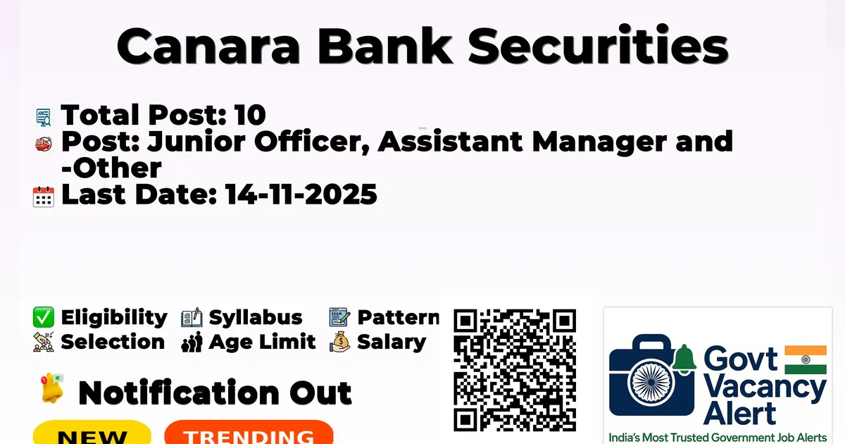 Canara Bank Securities has released an official notification for the recruitment of 10 Junior Officer, Assistant Manager and Other Posts. Interested and eligible candidates can apply Offline through the official Canara Bank Securities website. The last date to submit the application form is 14-11-2025. In this article, you’ll find the Canara Bank Securities Junior Officer, Assistant Manager and Other Posts recruitment details, including eligibility criteria, age limit, salary structure, selection process, application steps, and direct links to the official notification and Offline application form. Join Our Arattai Channel: Join Here Advertisement Company Name Canara Bank Securities Post Name Junior Officer, Assistant Manager and Other No of Posts 10 Pay Matrix Rs 34,800 to 50360 Qualification Any Graduate, B.Tech/B.E, CA, MBA/PGDM Age Limit 20 to 30 years Last Date for Apply 14-11-2025 Official Website canmoney.in