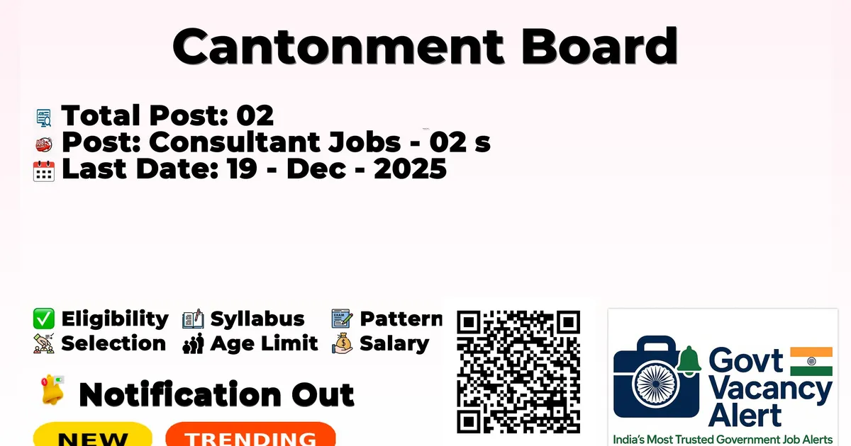 Delhi Cantonment Board has declared the official notification for 2025. To fill up the vacancies for 02 Consultant Jobs. Those candidates who have qualified in the Post Graduation can grab this chance and apply for the Delhi Cantonment Board Recruitment 2025. Here, we include the age limit, selection process, salary structure, education details, application fee, and how to apply for these posts. Interested and eligible candidates can apply before the last date of application.