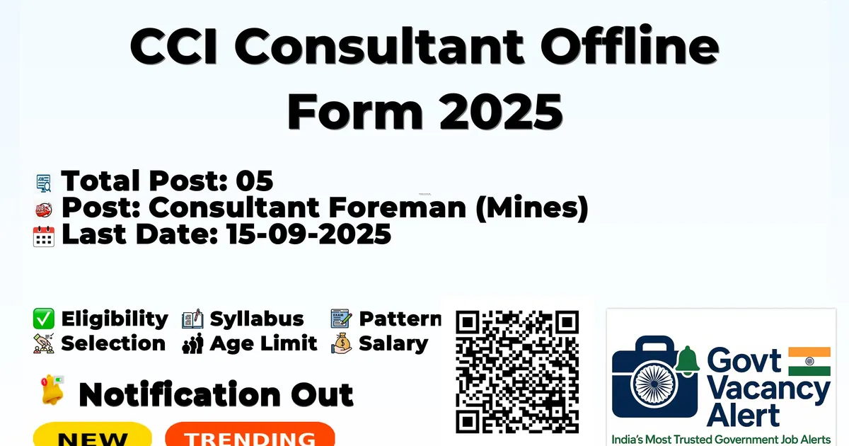 The Cement Corporation of India (CCI) Recruitment 2025 for 05 posts of Consultant. Candidates with 10TH Can Apply Offline. The Offline application closes on 15-09-2025. The candidate shall apply Offline through CCI website, cciltd.in.