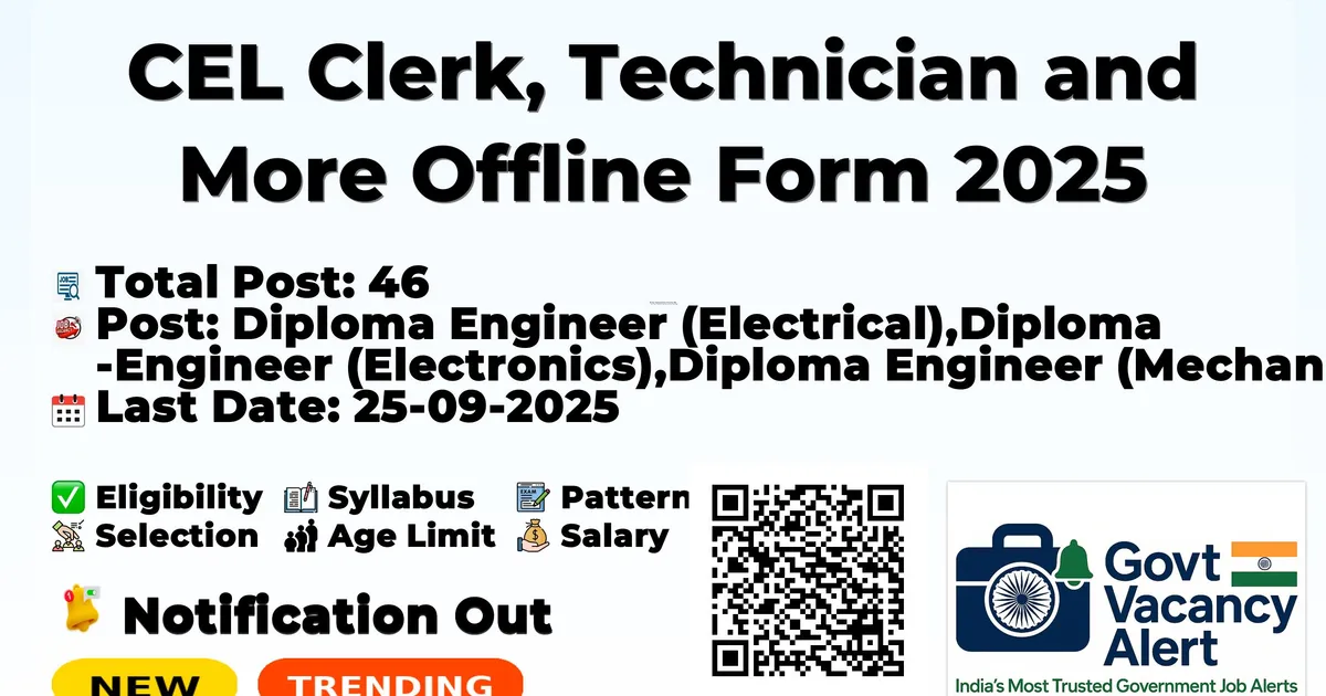 The Central Electronics (CEL) Recruitment 2025 for 46 posts of Clerk, Technician and More. Candidates with Any Graduate, Diploma, ITI, 10TH Can Apply Offline. The Offline application opens on 11-09-2025, and closes on 25-09-2025. The candidate shall apply Offline through CEL website, celindia.co.in.
