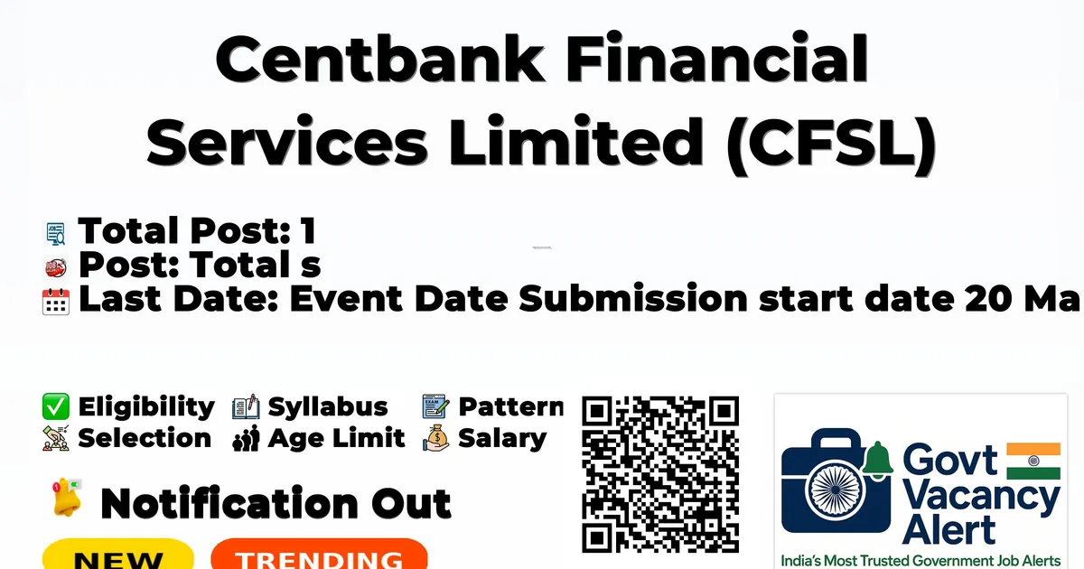 Centbank Financial Services Limited (CFSL) Manager (Accounts) on Contract Basis Notification 2026 has been released on 20 March 2026 on the official website https://www.cfsl.in/. A total of 1 vacancy has been announced through the CFSL Manager (Accounts) Recruitment 2026.
