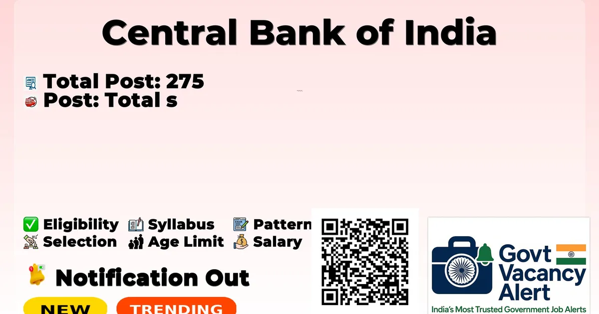 Central Bank of India has released an official notification for the recruitment of 275 Specialist Officers Posts. Interested and eligible candidates can apply Online through the official Central Bank of India website. The last date to submit the application form is 23-03-2026.