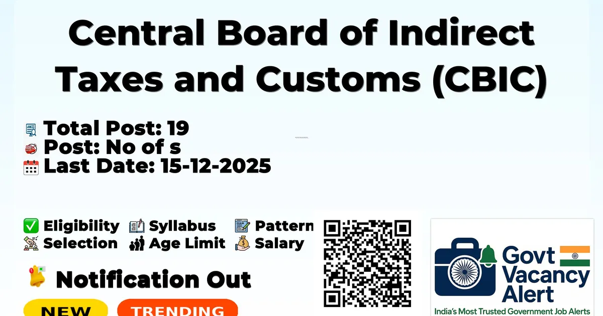 Company Name Central Board of Indirect Taxes and Customs (CBIC) Post Name Seaman, Tradesman and More No of Posts 19 Salary Rs.18000 - 63200/- Qualification ITI, 10TH Age Limit 18 to 30 years Start Date for Apply 08-11-2025 Last Date for Apply 15-12-2025 Official Website cenexcisekochi.gov.in