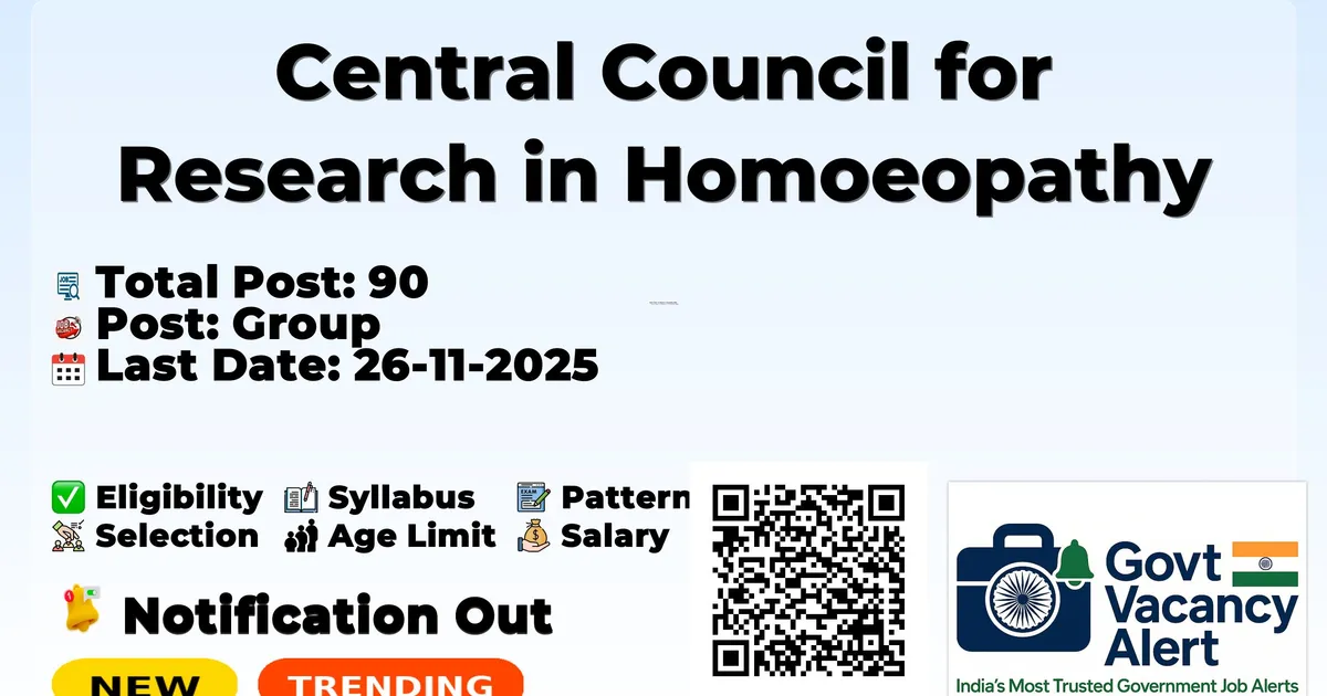 Central Council for Research in Homoeopathy (CCRH) has released an official notification for the recruitment of 90 Group A, B & C Posts. Interested and eligible candidates can apply Online through the official CCRH website. The last date to submit the application form is 26-11-2025. In this article, you’ll find the CCRH Group A, B & C Posts recruitment details, including eligibility criteria, age limit, salary structure, selection process, application steps, and direct links to the official notification and Online application form.