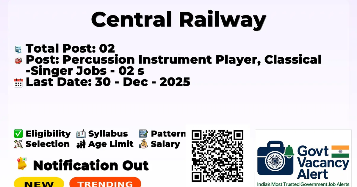 The Central Railway has officially released the notification to fill the vacancies of 02 Percussion Instrument Player, Classical Singer Jobs. Interested and eligibile candidates can use this opportunity to apply for these posts before the last date of application. Candidates who have completed their 10th pass, ITI, 12th, Diploma, and Any Degree can apply for the Central Railway Jobs 2025. The interested applicants can apply in online mode. Here we have mentioned the education details, age limit, selection process, application fee, salary, and how to apply for these posts before the deadline. The application dates have already begun.