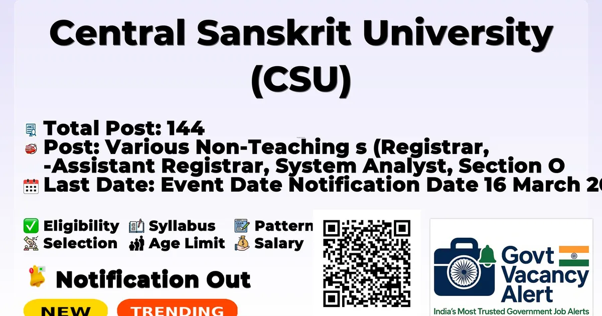 Company Name Central Sanskrit University (CSU) Post Name Various Non-Teaching Posts (Registrar, Assistant Registrar, System Analyst, Section Officer, Nursing Officer, Assistant, Guest House Manager, Junior Engineer, Personal Assistant, Professional Assistant, Technical Assistants, Stenographer, Upper Division Clerk, Library Assistant, Lower Division Clerk, Driver, Multi-Tasking Staff, Library Attendant, Medical Attendant/Dresser) No of Posts 144 Advt No 02/2026 Salary Pay Level (as per 7th CPC) – Level-14 to Level-01 (post-wise details given below) Qualification As per detailed notification (to be uploaded on website) Age Limit As per detailed notification Last Date 16-04-2026 (Online) + Hard Copy within 15 days Apply Mode Online (SAMARTH) + Hard Copy Job Type Direct / Deputation (post-specific)