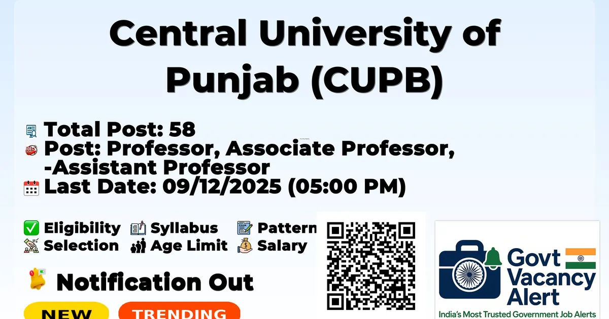 Central University of Punjab has released an official notification for the recruitment of 58 Teaching Posts. Interested and eligible candidates can apply Online through the official Central University of Punjab website. The last date to submit the application form is 09-12-2025. In this article, you’ll find the Central University of Punjab Teaching Posts recruitment details, including eligibility criteria, age limit, salary structure, selection process, application steps, and direct links to the official notification and Online application form.