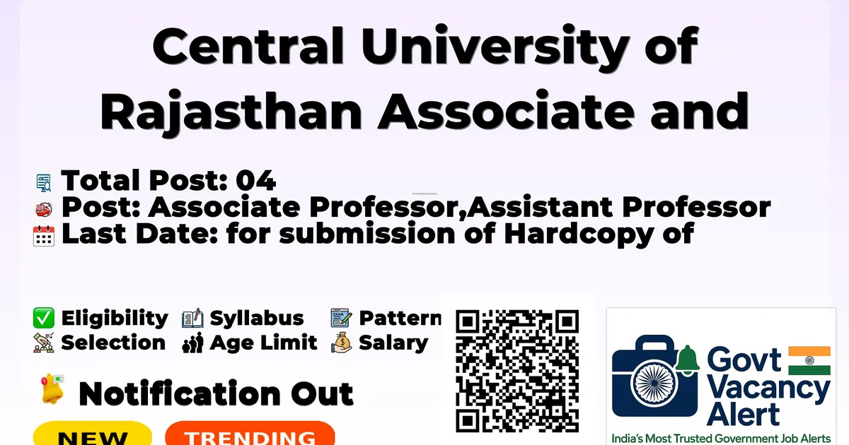 The Central University of Rajasthan Recruitment 2025 for 04 posts of Associate Professor, Assistant Professor. Candidates with B.Tech/B.E, M.Sc, M.E/M.Tech, M.Phil/Ph.D Can Apply Online. The online application opens on 01-09-2025, and closes on 15-10-2025. The candidate shall apply online through Central University of Rajasthan website, curaj.ac.in. The Central University of Rajasthan Associate Professor, Assistant Professor Recruitment 2025 Notification PDF has been released on 13-09-2025 at curaj.ac.in. Check the complete job details, vacancy, age limit, application fee, selection process and how to apply from the article.You can Check all Latest Sarkari Result Updates of All Central Government Jobs and State Government Jobs. Central University of Rajasthan Associate Professor, Assistant Professor Recruitment 2025 Notification PDF