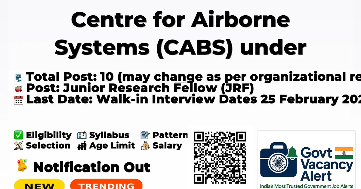 DRDO Centre for Airborne Systems (DRDO CABS) has released an official notification for the recruitment of 10 Junior Research Fellowship Posts. Interested and eligible candidates can apply Offline through the official DRDO CABS website. The last date to submit the application form is 22-02-2026. In this article, you’ll find the DRDO CABS Junior Research Fellowship Posts recruitment details, including eligibility criteria, age limit, salary structure, selection process, application steps, and direct links to the official notification and Offline application form.
